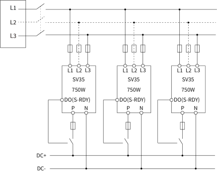 - 驱动器上电后,当驱动器出现S-RDY状态时候,驱动器的DO输出就绪信号,控制继电器吸合,实现共母线连接;