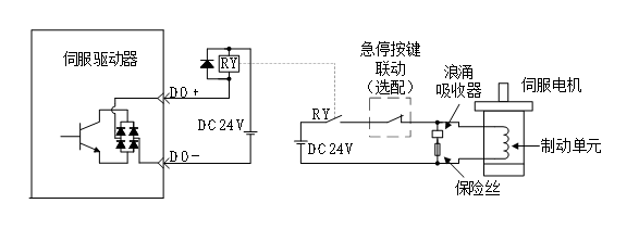 - 内置于伺服电机中的抱闸机构,仅用于电机的停机抱闸,频繁使用电机抱闸进行急停操作会缩短其使用寿命。当伺服电机速度小于20rpm时,才允许抱闸供电断开;