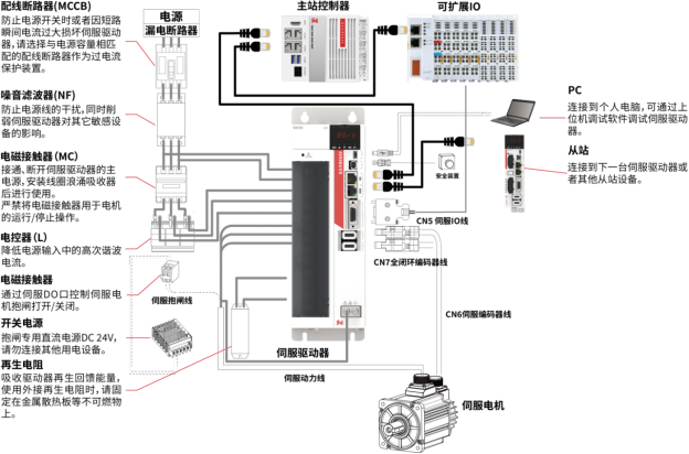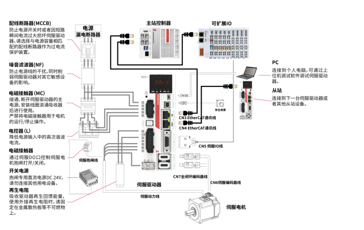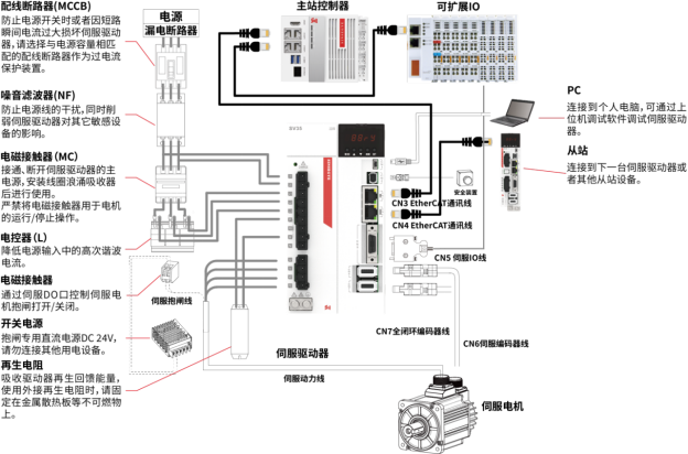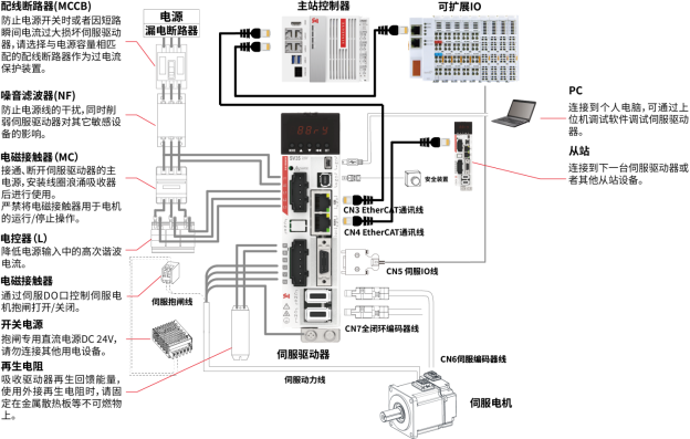- CN3为EtherCAT通信输入,连接控制器或上一台伺服;CN4为EtherCAT通信输出,连接下一台伺服。
