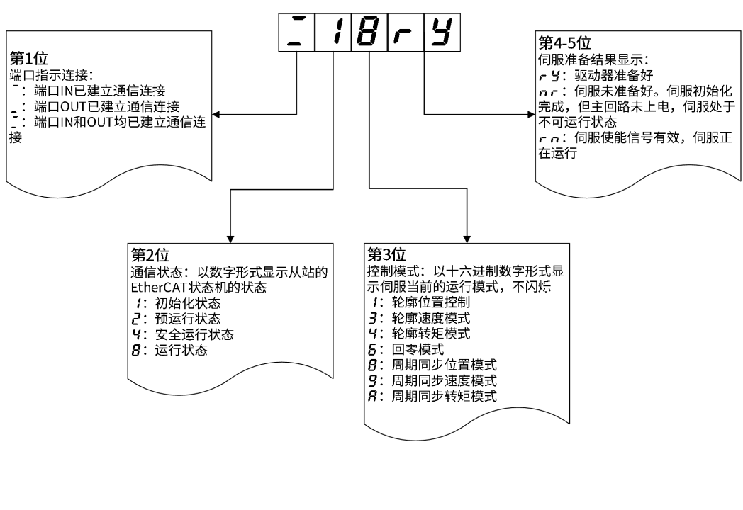 18ry:伺服准备好 | 伺服准备好 | 伺服驱动器在端口1已建立连接、通信初始化状态、周期同步控制模式下处于可运行状态 | |