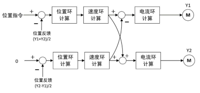 我司龙门控制采用领先的交叉解耦算法,其控制示意图如下图所示,Y1 轴为主轴,位置反馈采用两轴编码器反馈的平均值((Y1+Y2)/2),控制龙门系统线性运动;Y2 轴为差动轴,位置反馈采用两轴编码器反馈差值的平均值(Y2-Y1)/2,控制龙门系统旋转运动(两轴之间的 偏差);两轴之间通过 10M 的高速总线交互数据。由这种交叉形式的编码器反馈,经过每个轴的环路 PID 调节之后,将速度环的输出(即转矩指令)再次通过通信交互给对方,由此两轴之间的环路控制相互解耦,控制龙门同步运行。