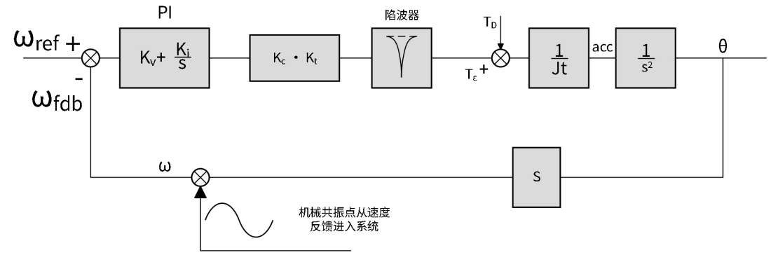 当伺服增益系数比较大时,高频振动成分不能有效衰减,会激发系统共振,为了不减弱伺服响应性能,在增益不降低的情况下,平稳驱动机械负载,需要对共振有效抑制。一般伺服厂家会在控制环路前项通道设置陷波器,通过定点削弱共振点处的环路增益幅值,达到振动抑制的目的。