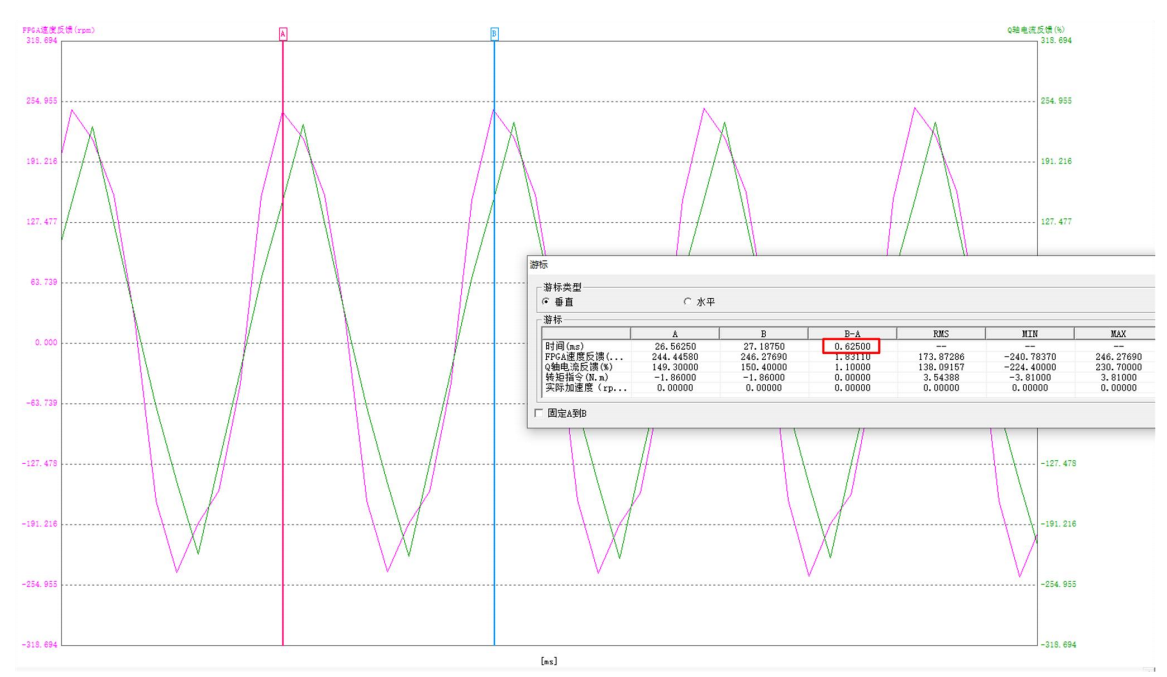 通过示波器界面显示的电机电流获得(相电流、转矩指令、电流反馈均可)。如下图所示,测得周期为0.625ms,计算得共振频率:f = 1/t =1600 Hz