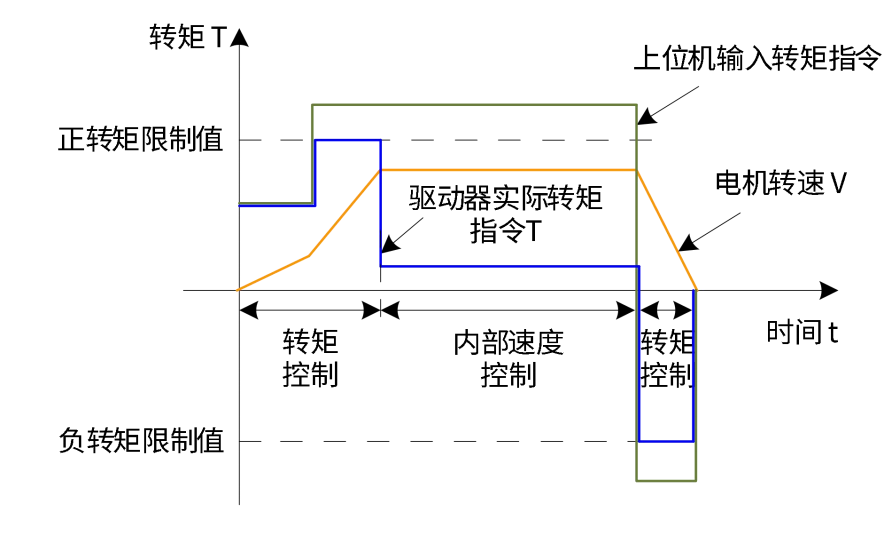 当上位机输入或速度调节器输出的转矩指令的绝对值,大于转矩指令限制的绝对值时,则实际驱动器的转矩指令被限幅等于转矩指令限制值;反之,则等于上位机输入或速度调节器输出的转矩指令值。任一时刻,有且只有一个转矩限制值有效。且正负转矩限制值均不超过驱动器和电机的最大转矩以及±300.0%额定转矩。