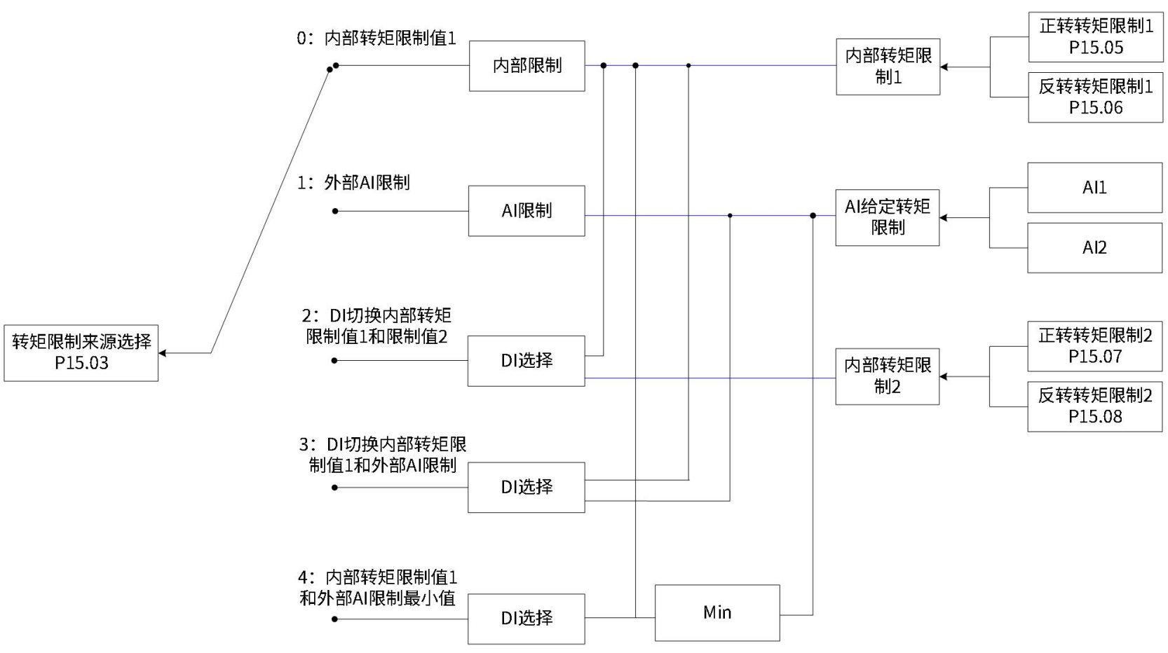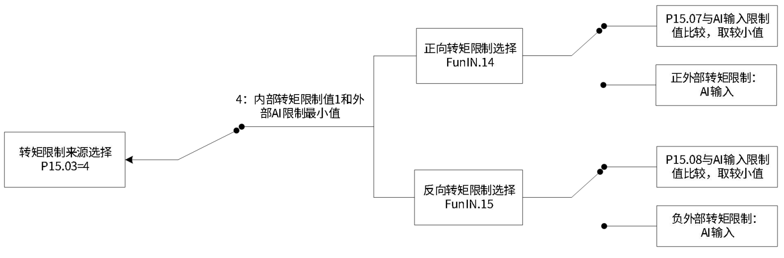 P15.03 = 4:内部转矩限制值1和外部AI限制最小值