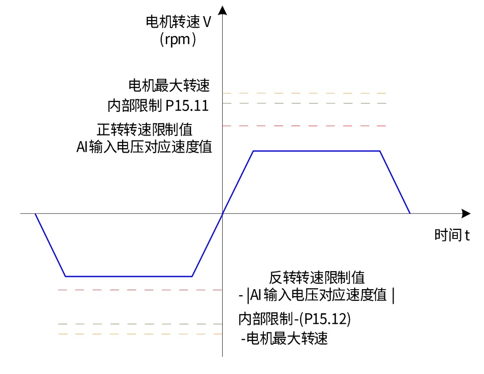 电机不同方向运动时,通过P15.10指定的外部模拟通道,输入转速限制对应的电压。当AI输入小于内部速度限制(P15.11/P15.12)时,AI限制有效;反之,当AI输入大于内部速度限制(P15.11/P15.12)时,内部速度限制有效。