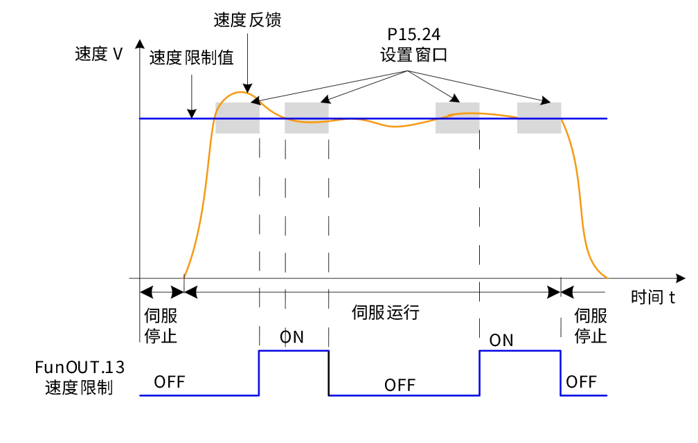 转矩模式下,伺服电机实际转速绝对值超过速度限制值,且时间达到P15.24时,认为伺服电机实际转速受限,此时伺服驱动器可输出速度限制 (FunOUT.13:速度限制)信号,供上位机使用。反之,不满足任一条件,速度限制信号无效。