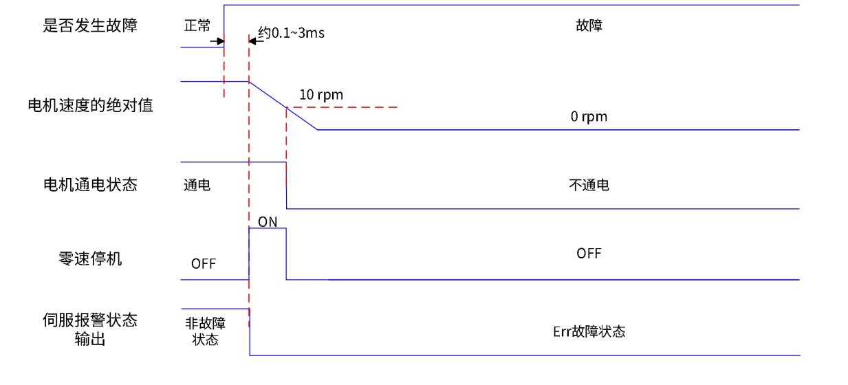 伺服发生第3类警告: A.220(正向超程警告)、A.221(反向超程警告)时,将中断伺服当前运行状态,其停机时序如F)所示。