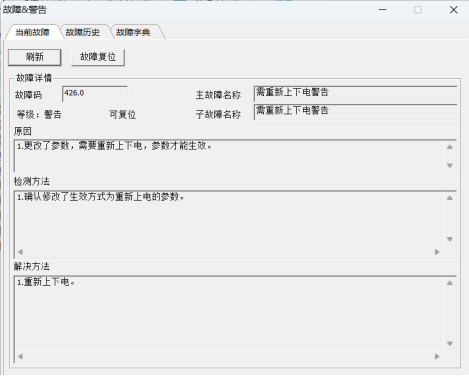 故障详情包含:故障名称、等级、是否可复位、故障原因、检测方法和解决方法等,方便用户快速排查故障。