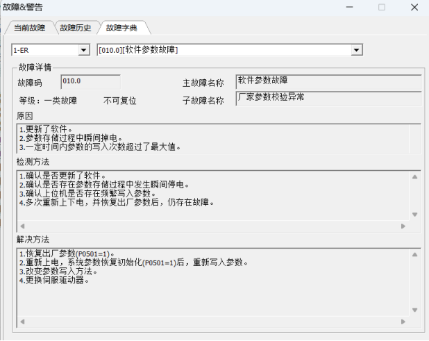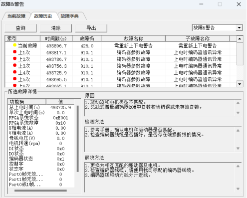 “查询”按钮:查询设备最近几次故障历史,信息如上图; “清除”按钮:清除驱动器中历史故障记录; 鼠标选中历史列表行,列表下方显示所选故障时相关参数信息以及故障排查信息;